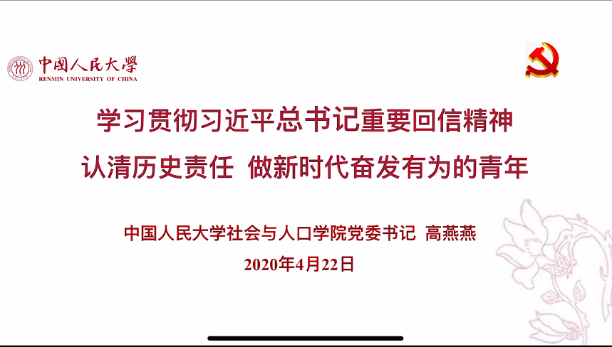 2020-04-24 文:黄色漫画 图:黄色漫画2020年4月22日下午,社会与人口学院第21期院党校入党积极分子培训班第一次线上党课培训成功举办。本次线上党课由社会与人口学院党委书记高燕燕主讲,社会与人口学院党委副书记唐颖主持,学院全体入党积极分子参加了本次线上学习。