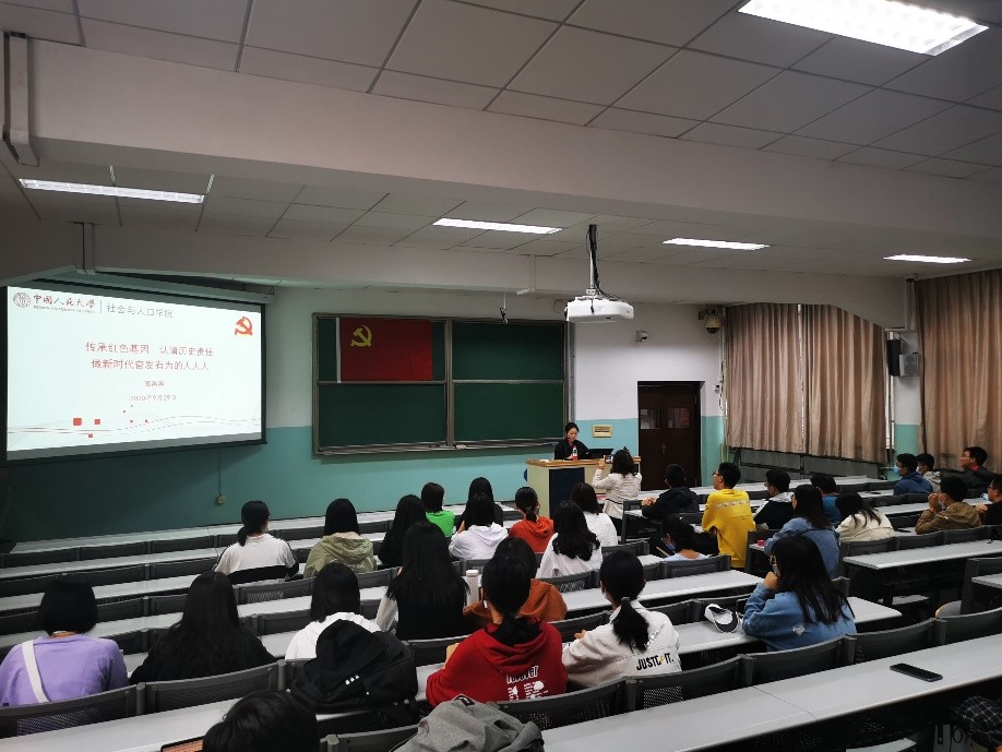 2020年9月29日上午,社会与人口学院“红船精神”专题党课成功举办,本次党课由社会与人口学院党委书记高燕燕主讲,社会与人口学院党委副书记唐颖主持,学院全体新生参加党课学习。