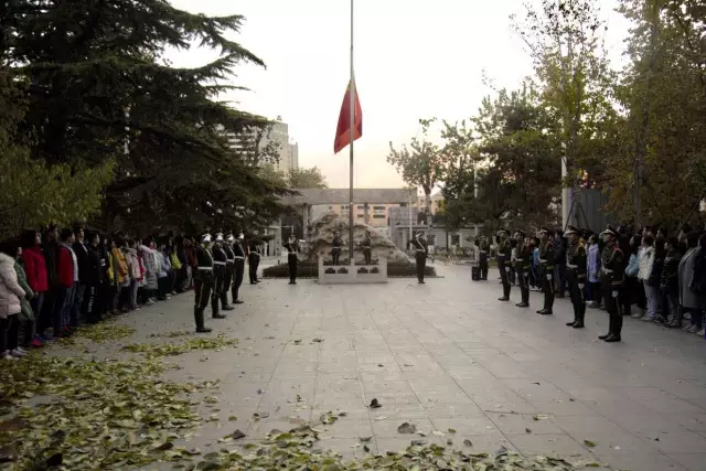 仪式第一项是出旗,由国防生组成的国旗仪仗队整齐有序地护送着国旗缓缓向前,嘹亮的口号声,铿锵的踏步声,使原本寂静的小广场显得更加庄严与肃穆。第二项仪式是升国旗,深秋的寒风凛冽而又刺骨,但大家的眼中却是满满的坚定与激动,国旗迎风飘扬,缓缓上升,国歌声盘旋在广场之上,更唱响在每一位同学的心里。同学们嘹亮的歌声打破了寂静的清晨,彰显着新时代青年的精神风貌。