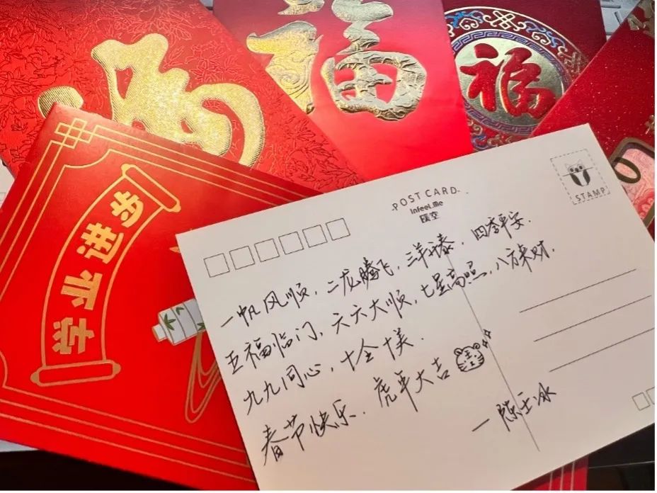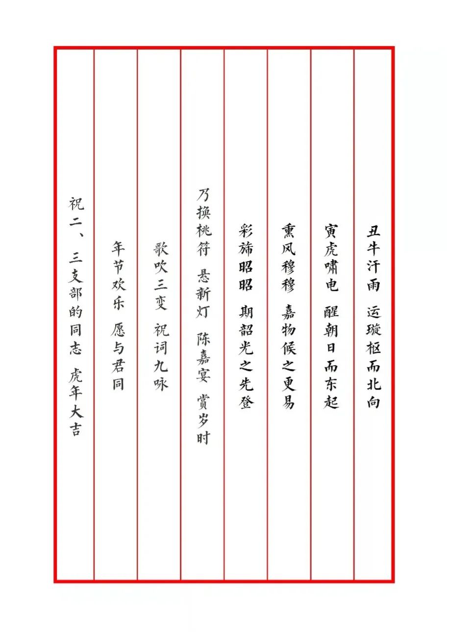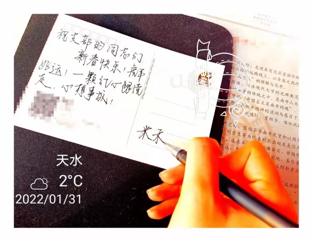 支部党员们手写新春祝福,以照片或视频的形式献上新春祝福。三支部的刘芷桐同志的新年祝福语这样写道“愿我们早日战胜新冠、平安健康、顺遂幸福地度过虎年!”,三支部的晏雨琦同志祝福大家:“大家新年好呀!祝大家新的一年平安健康,万事胜意,天天开心!”二支部的管晓方同志写道“希望同志们在新的一年能以虎虎生威的雄风、生龙活虎的干劲、气吞万里如虎的精神共谱新篇,不断向前!”。