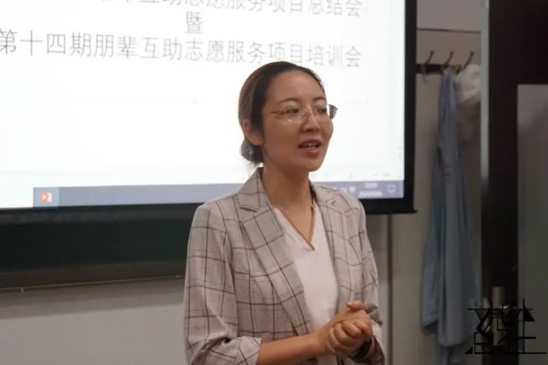 颁奖完毕后,党委副书记唐颖发言并对新一届志愿者进行培训。她提到,朋辈志愿服务项目已经走过了13个年头,取得了很多成绩,但依然还有进步的空间,这需要参与的同学共同努力,希望同学们在帮助他人的同时也能实现自我的成长。她强调了工作中的伦理、专业的工作方法、以及注意事项。最后她表示,朋辈志愿服务项目的标志是一座桥,象征着大小朋辈间的桥梁,希望志愿者们能够像桥梁一般,将朋辈互助的精神一代代传承下去。
