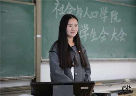 首先,现任院学生会主席2014级本科生鹿杨上台发言。她表示了对各位新生的欢迎,并分享了自己在学生工作方面的一些经验,同时提出了一直伴随着她的三个问题:“如果我加入学生会的话我会变成一个什么样的人?学生会会带给我什么样的成长?我又会有怎样的不同?”随后鹿杨表达了她对各位新生干事的真切期望,希望学生会成员们能担起责任、不忘初心、不负传统。
