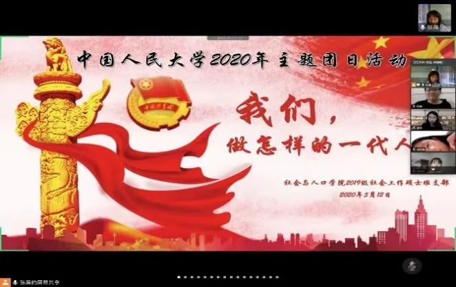 2018级硕士人口班团支部通过线上会议与研讨来进行本次活动。首先团支书带领全体团员对政府工作报告和工作计划进行了学习,之后通过视频了解了“中国青年五四奖章”获得者的故事,在学习先进青年事迹的基础上,团员结合自身实际交流了今后工作或读博的打算,纷纷表态要做踏实、积极、负责、进步的一代人。有的同学从奔赴抗疫第一线的医疗人员身上看到了人生奋斗的价值,有的同学对国家的未来充满希冀,希望在祖国的保驾护航下也承担一些社会公益,尽自己的一份力。此次会议让团支部的成员看到青年实现价值的多种可能,更增强了团员对祖国的信心,更能奋勇向前。