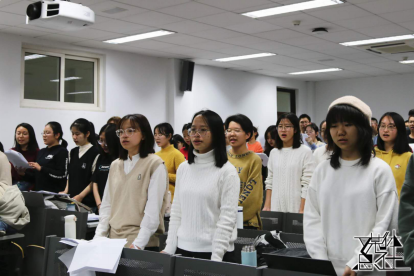 随后,党建促进会会长2018级本科生刘荷、分团委副书记2018级本科生何雨辰、研究生会主席2019级硕士生温馨、舞蹈团团长黄远丰以及张芷凌老师、李桢老师作了发言。他们或为同学们的演唱提出宝贵建议,或带领新生们回顾“一二·九”的历史渊源,或分享了参与“一二·九”的点滴体验。李桢老师在讲话中提到,学院会为同学们提供充足的物资保障,让大家可以在舞台上充分展现自身风采。同时,他也对同学们提出了希望:合唱不仅需要个人声音的婉转动听,更需要大家融入集体,体现出一种“合”的状态。最后,老师嘱咐同学们注意自身健康,要做好保暖。希望大家在接下来的半个月中继续努力,在比赛中呈现完美的和声。