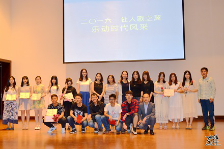 2016-05-22 文:黄色漫画 图:黄色漫画2016年5月15日19时,第九届“歌之翼·唱响时代新风”歌手大赛决赛在国学馆报告厅拉开帷幕。本次决赛的专业评委有校团委校园文化部部长李广老师,社会与人口学院人口学系副教授宋月萍老师,学院08级校友高珊,12级校友王红以及第十一届“你的舞台”校园十佳歌手大赛冠军焦翊丹。社会与人口学院党委副书记唐颖老师应邀出席本次活动。