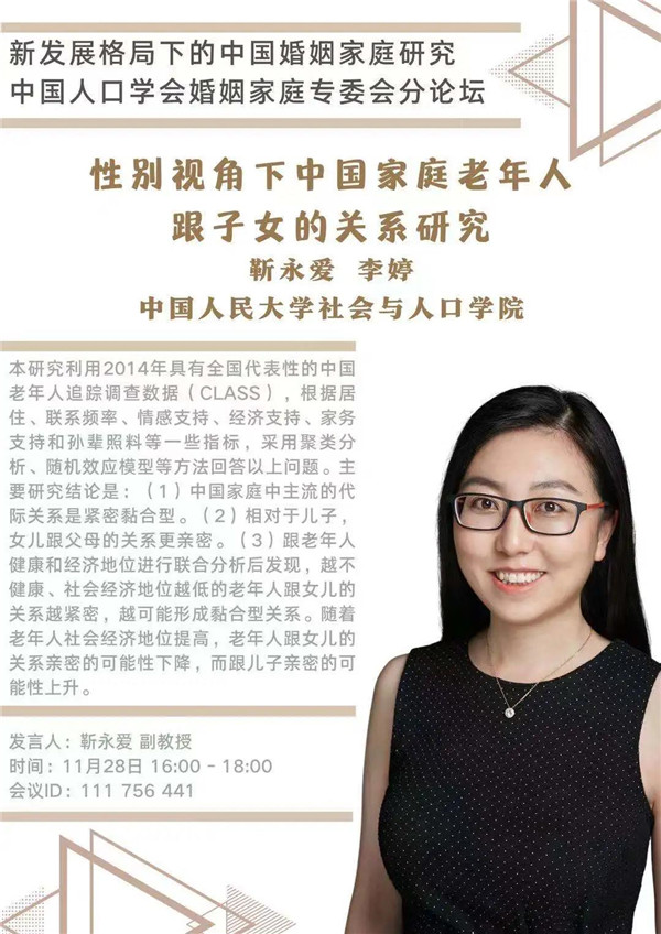 中国人口学会年会将于2020年11月28-29日在陕西西安召开。会议期间,婚姻家庭专委会将组织“新发展格局下的中国婚姻家庭研究”为主题的分论坛,6位来自国内各高校、研究机构的研究者将就家庭关系、养老、生育、家庭发展等主题展开讨论。届时欢迎各位同仁线上线下参与讨论!