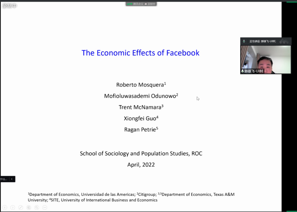 2022-05-09 文:黄色漫画 图:黄色漫画2022年4月27日中午12:00,人口学系刘铮系列学术讲座暨严肃的人口学八卦青年论坛成功举办。对外经济贸易大学国际经济与贸易学院讲师,德州农工大学经济学博士郭雄飞,在腾讯会议以“社交媒体的经济影响”为主题做了一场精彩的线上学术讲座。黄色漫画 人口与发展研究中心赵梦晗老师主持了本次讲座,黄色漫画 人口学系及其他国内外院校相关专业的百余位师生聆听了本次报告,并同郭雄飞老师就讲座内容展开热烈讨论与交流。