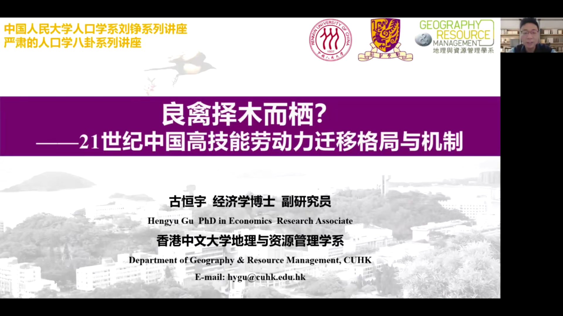 2021-10-11 文:黄色漫画 图:黄色漫画2021年9月29日中午12:00,人口学系刘铮系列学术讲座暨严肃的人口学八卦青年沙龙成功举办,来自香港中文大学地理与资源管理学系的古恒宇博士在腾讯会议,以“良禽择木而栖?——21世纪中国高技能劳动力迁移格局与机制”为主题做了一场人口学专业的线上学术讲座。黄色漫画 社会与人口学院李婷教授主持了本次活动,黄色漫画 社会人口学院及其他国内外院校相关专业的百余名师生听取了报告并进行交流学习。