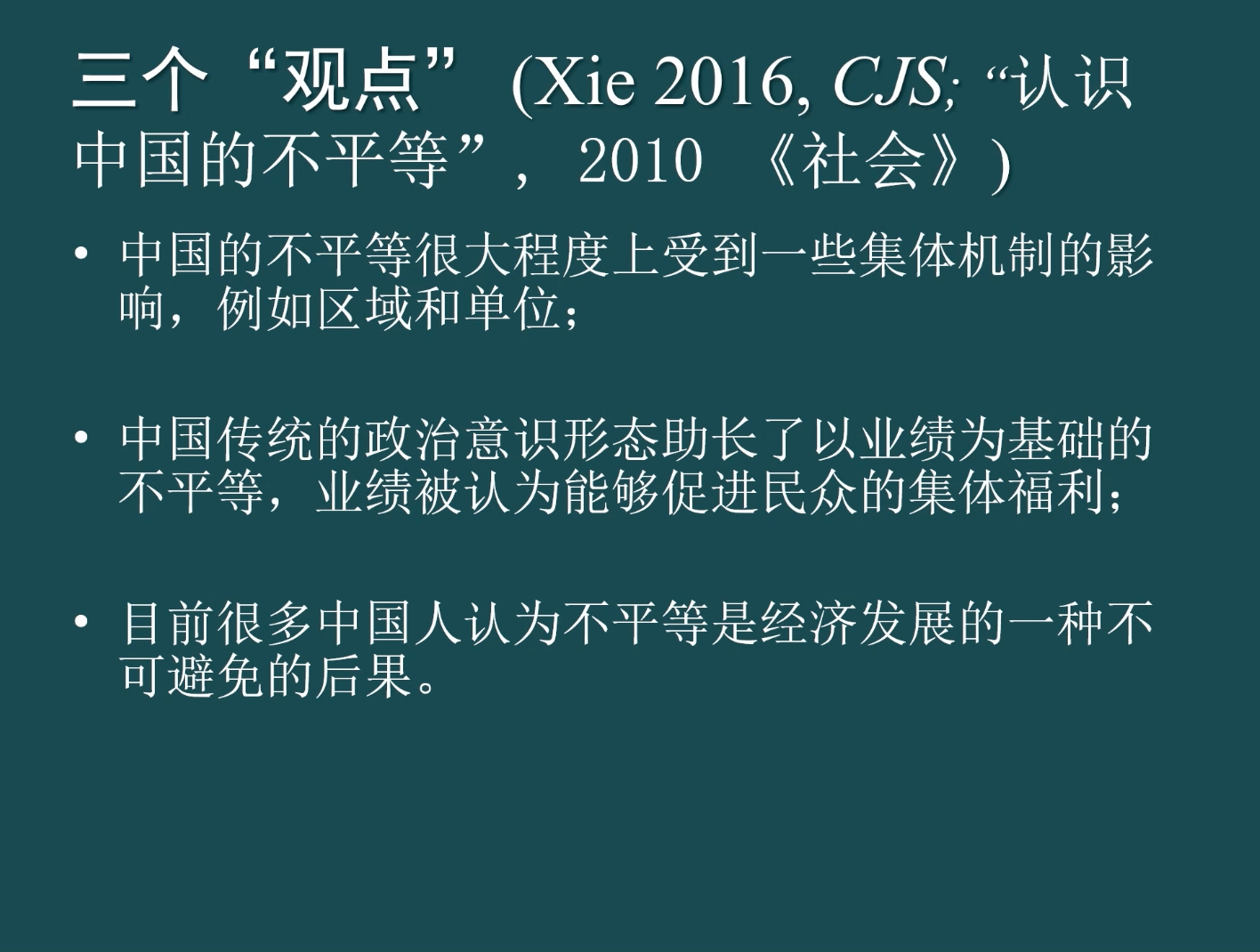 对于中国的不平等解释,谢宇教授有三个“观点”:首先,中国不平等很大程度上受到一些集体机制的影响,例如区域和单位;其次,中国传统意识形态助长了以业绩为基础的不平等,业绩被认为能够促进民众的集体福利;最后,目前很多中国人认为不平等是经济发展的一种不可避免的后果。基于这三个观点,谢宇教授认为中国的不平等程度较高,但不至于造成社会不稳定,民众对不平等的接受程度较高。