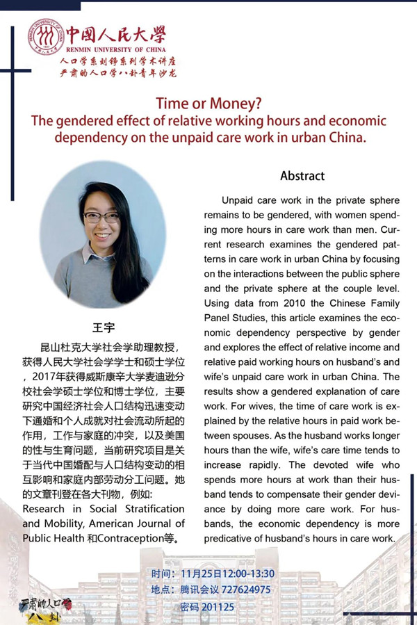 2020-11-24 文:黄色漫画 图:黄色漫画11月25日(周三)中午,人口学系刘铮系列讲座暨严肃的人口学八卦青年沙龙邀请昆山杜克大学助理教授王宇为大家带来讲座。本次讲座题目为:Time or Money? The gendered effect of relative working hours and economic dependency on the unpaid care work in urban China。