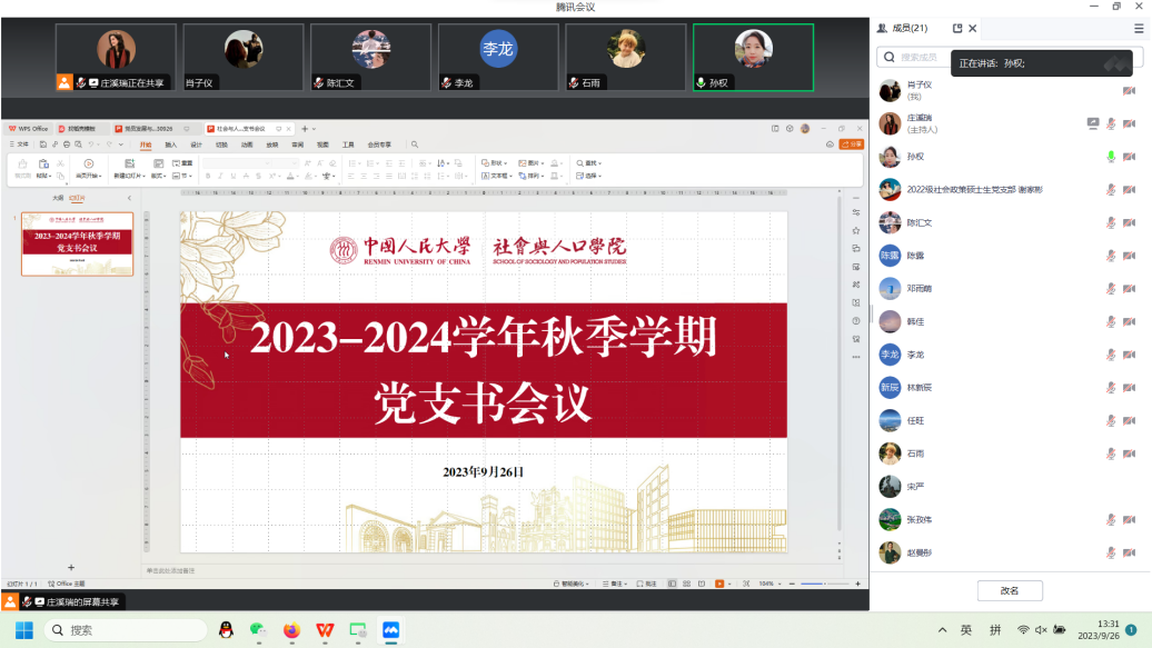 9月26日中午,社会与人口学院党支部书记工作例会在线上举行。党委书记孙权主持会议,学院党委办公室工作人员、学院教职工党支部书记及全体学生党支部书记参加会议。