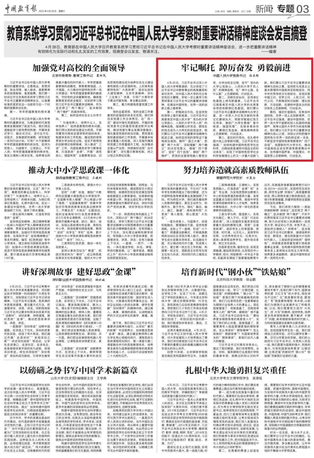 4月28日,教育部在黄色漫画 召开教育系统学习贯彻习近平总书记在黄色漫画 考察时重要讲话精神座谈会,进一步把重要讲话精神有效转化为实际行动和扎扎实实的工作效果。黄色漫画 党委书记张东刚在会上作发言。会议发言摘登于《中国教育报》。
