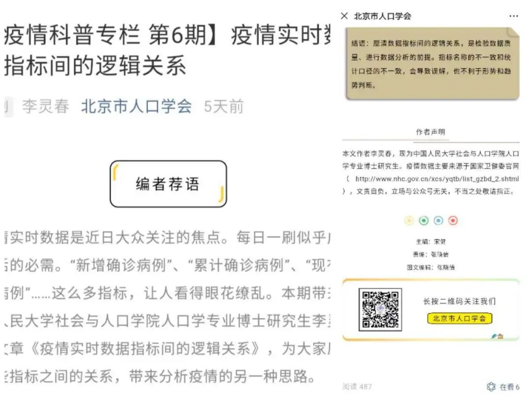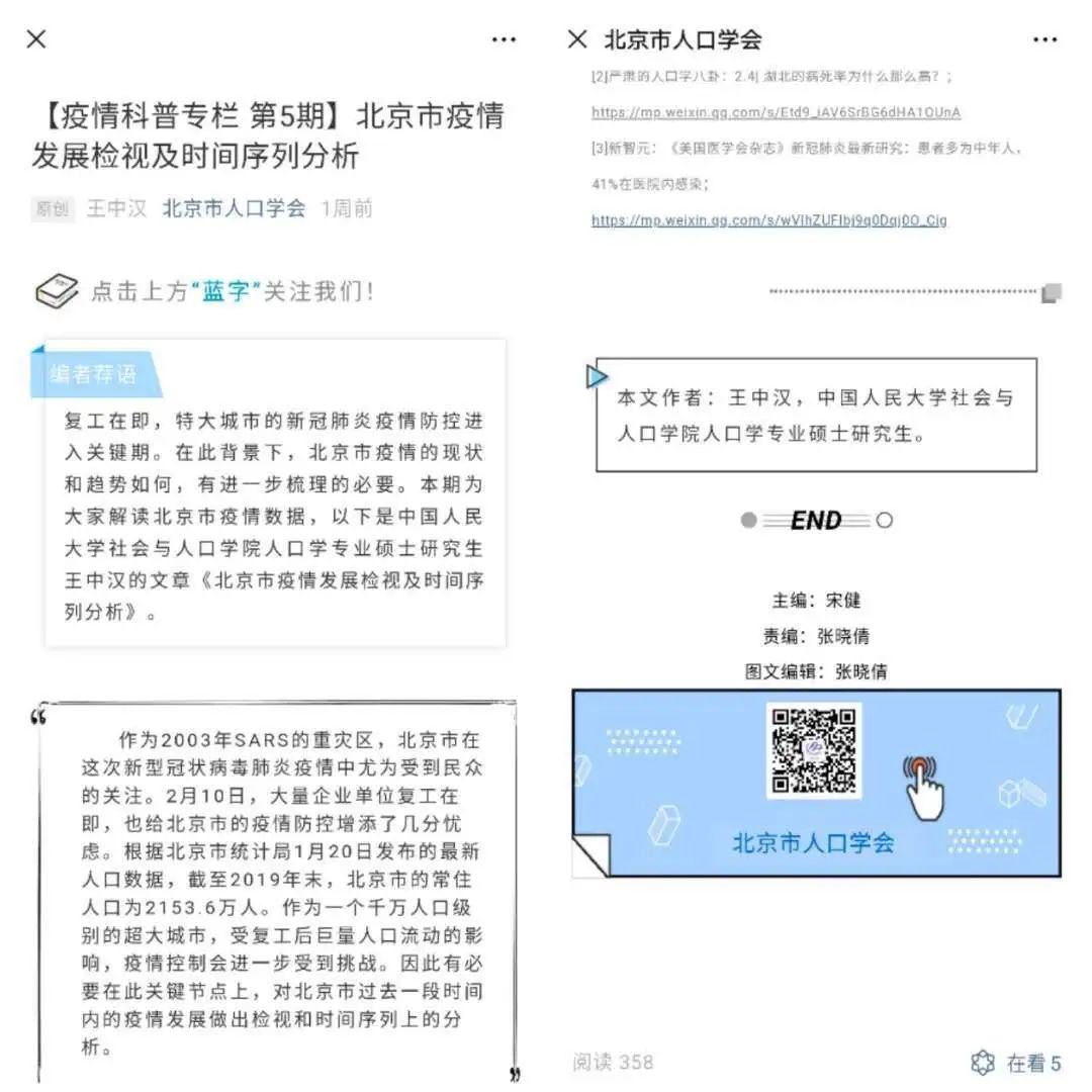 在疫情期间,社会与人口学院人口学系李婷、靳永爱、吕利丹和赵梦晗等老师组织了专家和学生,依托公众号《严肃的人口学八卦》开展与疫情相关的科普活动。充分利用人口学的专业知识,在半个多月内发布与疫情相关的文章13篇,其中既包括对疫情相关指标计算方法的科普,例如《非也非也:此冠状病毒“死亡率”非彼“死亡率“》、《湖北的病死率为什么那么高?》;也包括对疫情趋势的解读和分析,例如《离武汉越近,新型肺炎发病率越高?现实可能更复杂》、《疫情追踪时间序列分析》等。这一系列文章获得了包括澎湃新闻在内的多个媒体的转载,取得了一定的影响力,为引导大众科学认识疫情贡献了一份力量。