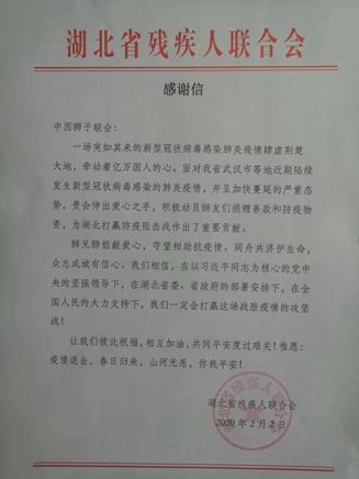 (湖北省残联对张娇所属公益组织发来的感谢信)