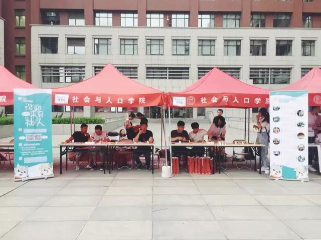 早上6点半,学院迎新志愿者完成了明德广场社会与人口学院迎新展台的布置工作,等待新生们的到来。8时许,新生们陆续前来报到,学院团委书记、党务秘书唐诗雅,团委常务副书记庄溪瑞负责现场组织与协调工作。
