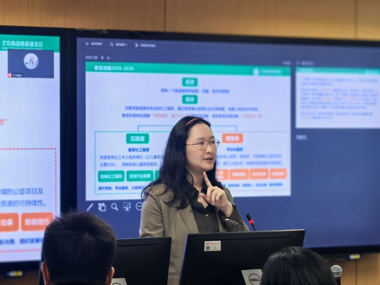 北京春苗慈善基金会副秘书长杨雅作了以“构建社区服务中心的实践与经验”为主题的分享。她首先介绍了北京春苗慈善基金会的基本情况、理念以及“小苗医疗”项目,接着就医务社工的发展、异地就医的现实困境等,介绍了社区多病种儿童服务中心项目“小勇士加油站社区模式”的背景和服务内容体系。其中,重点介绍了早产儿出院计划的实务经验,包括新家长助力计划、院内家长课堂与宣教、养育指导、生长发育合作、随访服务等。