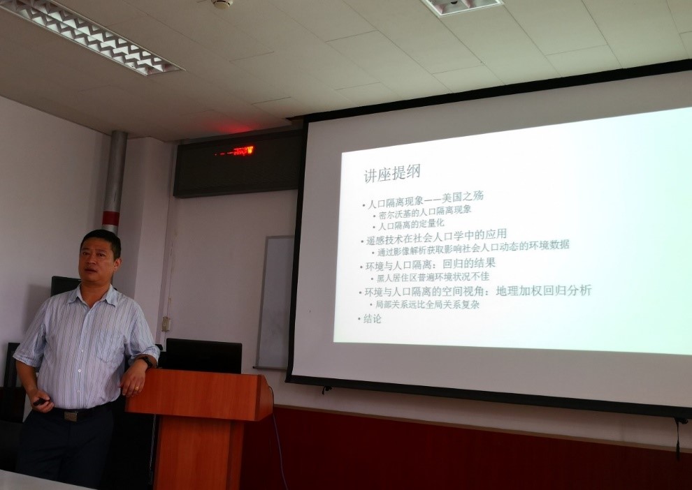 讲座中,余丹林教授首先介绍了主要体现在白人和非裔美国人之间的美国的人口隔离现象。余教授以“两个密尔沃基”为切入点,详细分析了密尔沃基市严重的人口隔离情况,并将人口隔离定量化,发现在密尔沃基80%的街区都是单一肤色人口。随后,余丹林教授介绍了遥感影像的特点,分析了遥感技术所具有的对社会人口研究较好的数据补充作用,并介绍了遥感图像在本项研究中的应用。余丹林教授紧接着介绍了人口隔离与环境状况的回归结果,结果表明隔离程度较高的区域(非裔美国人较多)普遍环境状况不佳。最后,余丹林教授介绍了地理加权回归分析方法,引入空间视角对人口隔离与环境状况进行分析,通过将地理加权回归于普通回归进行对比,发现相对于全局回归而言,地理加权回归的精度更高,且局部关系能够比全局关系更为全面细致的说明问题。同时,余丹林教授也强调,空间分析的结果需要与实地调研紧密结合,不能为空间分析而空间分析,而应该以解释问题、解决问题,为科学决策提供依据为目的。
