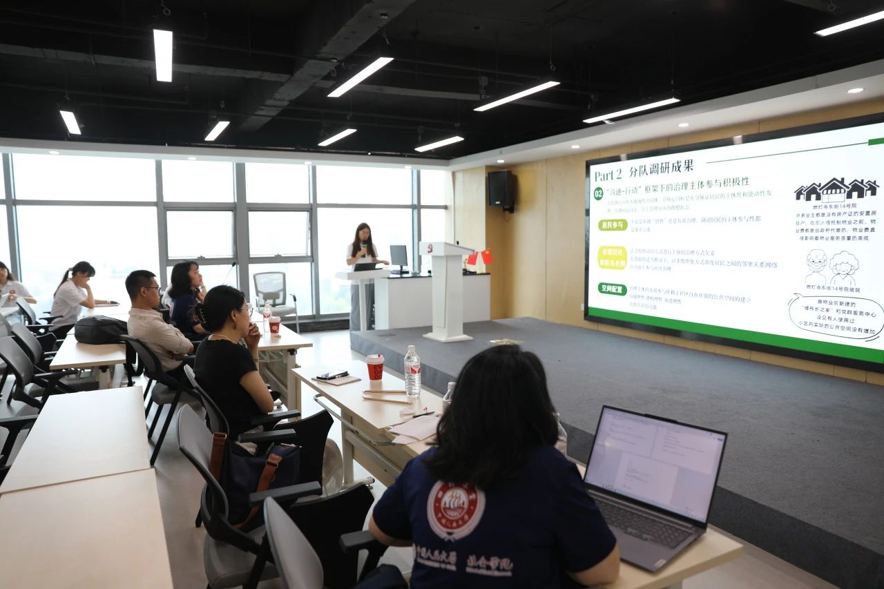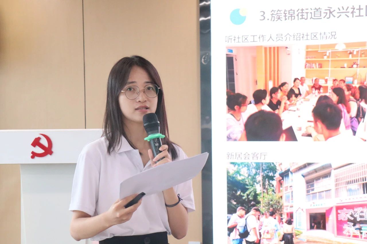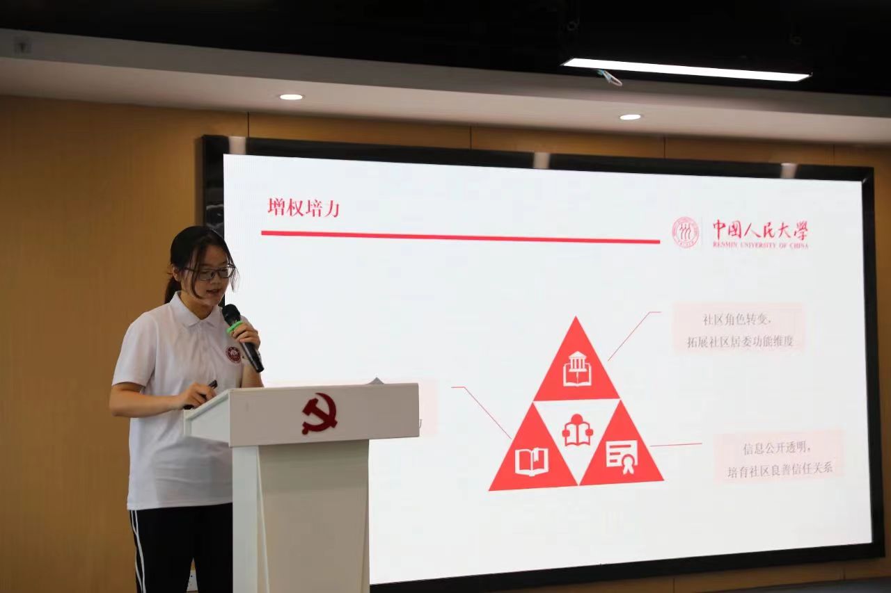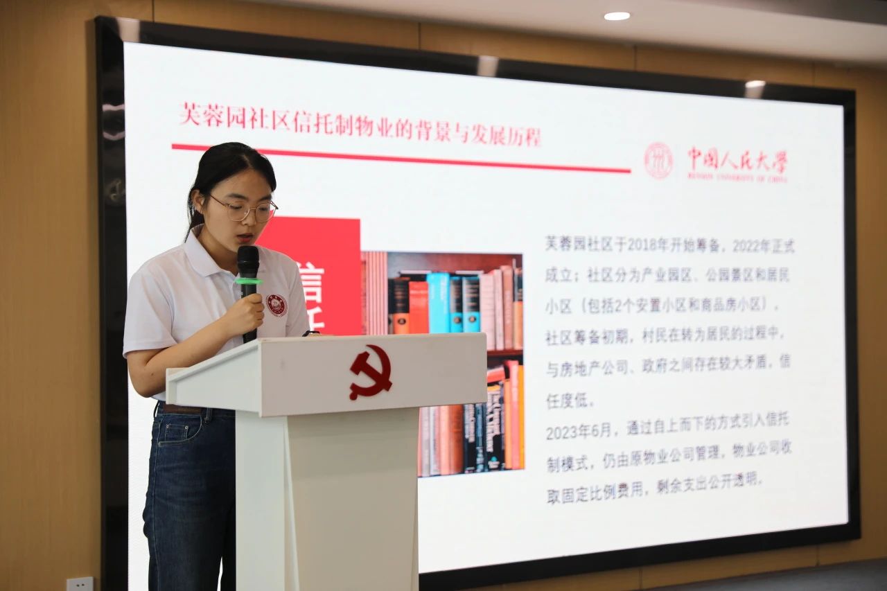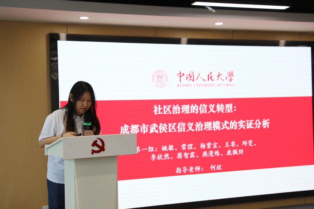 分组汇报环节,第一组成员围绕着“社区信义治理转型:成都市武侯区信义治理模式的实证分析”,介绍了四个下沉社区各自的基本情况及其导入信义治理的内在逻辑和过程,他们将信义治理的过程分为四步:社区诊断—共识达成—策略选择—增权培力。其中引入信托制物业的社区有金雁社区和芙蓉园社区;引入社区社会企业的是黉门街社区和锦城社区,还介绍了四个社区在运用社区基金和社区保障金来推行信义治理的场景。最后将四个社区能够成功推行信义治理的路径加以总结提炼,试图为其他社区提供经验借鉴。