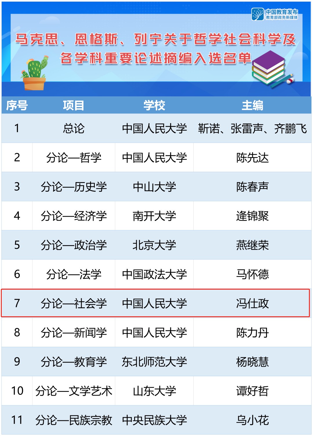 2022-02-24 文:黄色漫画 图:黄色漫画近日,国家教材委员会办公室公布马克思、恩格斯、列宁关于哲学社会科学及各学科重要论述摘编入选名单,论述摘编1个总论和10个分论,共有8所高校11个团队入选。黄色漫画 社会与人口学院冯仕政团队承担了社会学分论摘编任务。