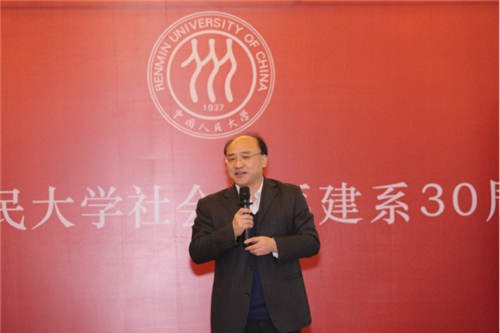 张建明代表学校致辞。他对从五湖四海返回母校参加建系三十周年的系友们表示欢迎。他回顾了人大社会学系从建系以来不断前进的光辉历史,指出正是老师们和同学们长期以来对社会学系的支持,才成就了社会学系现在的辉煌。他相信社会学系未来将会有更好的发展,欢迎系友们三十年后再回到母校见证人大社会学系的新成就。